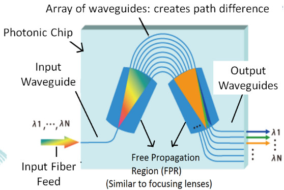 AWG(Arrayed Waveguide Grating)是密集波分復(fù)用系統(tǒng)(DWDM)中的首選技術(shù)。一組具有相等長度差的陣列波導(dǎo)形成的光柵,使用具有分波的能力。其原理為:含有多個(gè)波長的復(fù)用信號光經(jīng)中心輸入信道波導(dǎo)輸出后,在輸入平板波導(dǎo)內(nèi)發(fā)......
